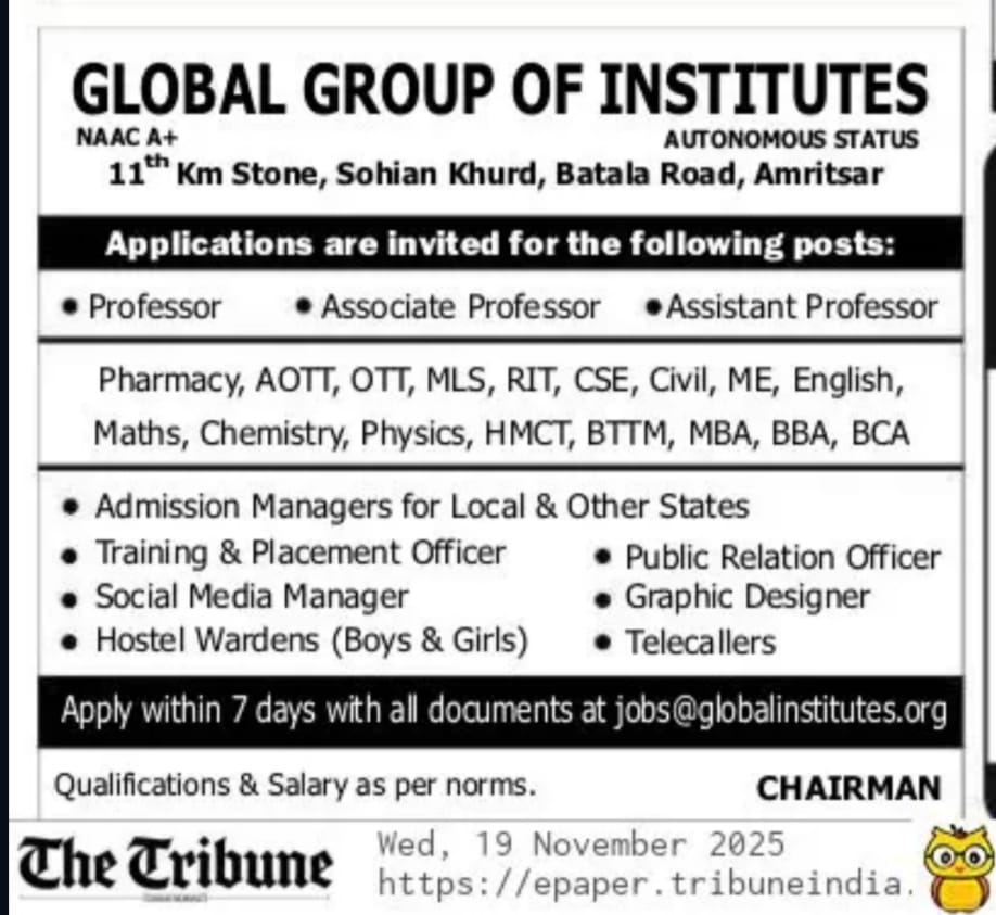 ADMISSION 2026-2027 Name Email Address Enter Mobile Number Country State City Address Select Courses* Select Course* B.TECH. (Computer Science & Engineering) B.TECH. (Artificial Intelligence & Machine Learning) B.TECH. (Civil Engineering) B.TECH. (Information Technology) B.TECH. (Mechanical Engineering) B.Pharmacy D.Pharmacy Master of Business Administration (MBA) Master of Computer Applications (MCA) Bachelor of Business Administration (BBA) Bachelor of Computer Applications (BCA) Bachelor of Commerce (B.Com.-Hons) Bachelor of Hotel Management & Catering Technology (BHMCT) Bachelor of Travel & Tourism Management (BTTM) B.Sc. (Medical Lab Sciences) B.Sc. (OTT) B.Sc. (Radiology Imaging & Technology) B.Sc (Anesthesia & Operation Theatre Technology) B.Sc (Fashion Design) B.Sc (Cyber Security) LLB BA LLB DIPLOMA (Computer Science & Engineering) DIPLOMA (Electrical Engineering) B.VOC (Hotel Management) B.Tech. CSE (LEET) B.Tech. AI & ML (LEET) B.Tech. IT (LEET) B.Tech. ME (LEET) B.Tech. CIVIL (LEET) BCA LEET B. Pharmacy (LEET) B.Sc. Medical Lab Sciences (LEET) B.Sc. Radiology & Imaging Technology (LEET) B.Sc. Anesthesia & Operation Theatre ( LEET) B.Sc. OTT (LEET) DIPLOMA CSE (LEET) DIPLOMA EE (LEET) I agree to receive notifications from Global Institutes in form of SMS/E-mail/Call. Register Global Group of Institutes Recent Recruitment Global Group of Institutes-School of Legal Studies Procedure and Performa for the post of Principal Procedure and Performa for the post of Assistant Professor Performa for the post of Non Teaching