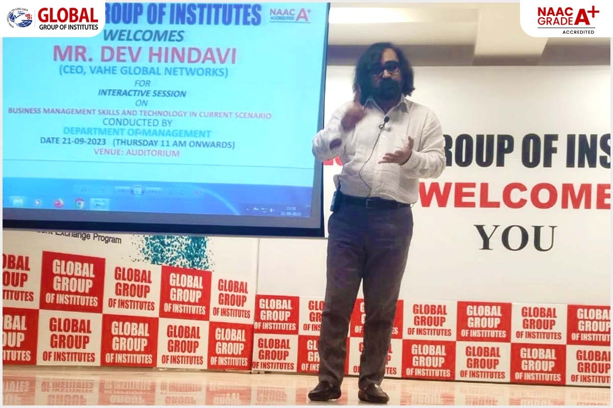 Department of Management of Global Group of Institutes organised a guest lecture on 21st September, 2023. The speaker of the occasion was Mr. Dev Hindavi a renowned poet, writer and film maker. He has been nominated for various International Film Festivals and won several awards for his craft.