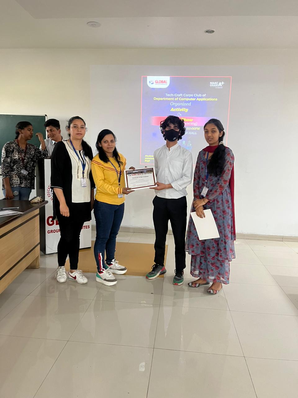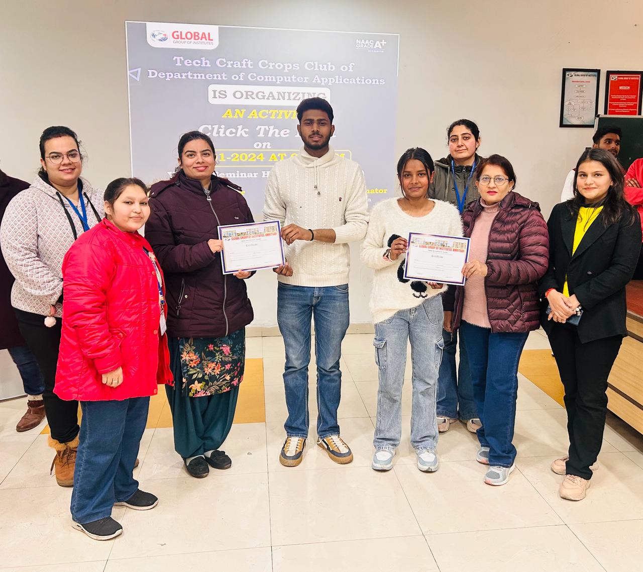 Tech Craft Corps Club of Department of Computer Applications organized “Technical Aptitude Test” on 23rd Jan 2019.The Objective of the test was to assess the technical skills and knowledge of participants. More than 50 Students of different streams participated in this Competition. Ms. Manisha of MCA stood first position, Mr. Abhi Chohan of MCA stood 2nd position and Mr. Sagar Sethi of B.Tech CSE stood third Position. The winners were awarded with certificates by Dr. M. S. Saini, Director (GIMET) and Dr. Leena Jain Head (CA).