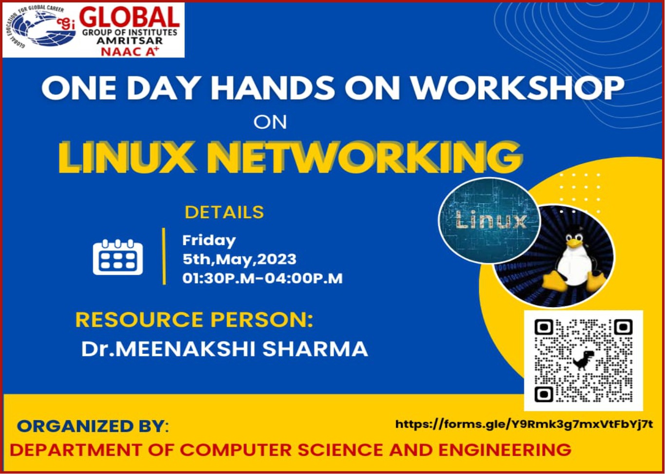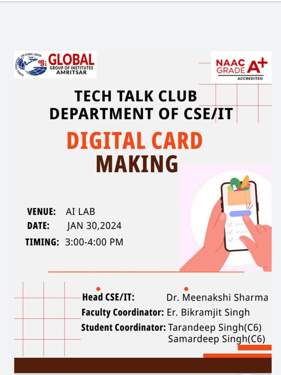 The department sincerely thanks Er. Tejinderdeep Singh, Head of Department (CSE/IT/AI&ML), and appreciates the efforts of student coordinators Palakdeep (C6) and Sagar (C6).