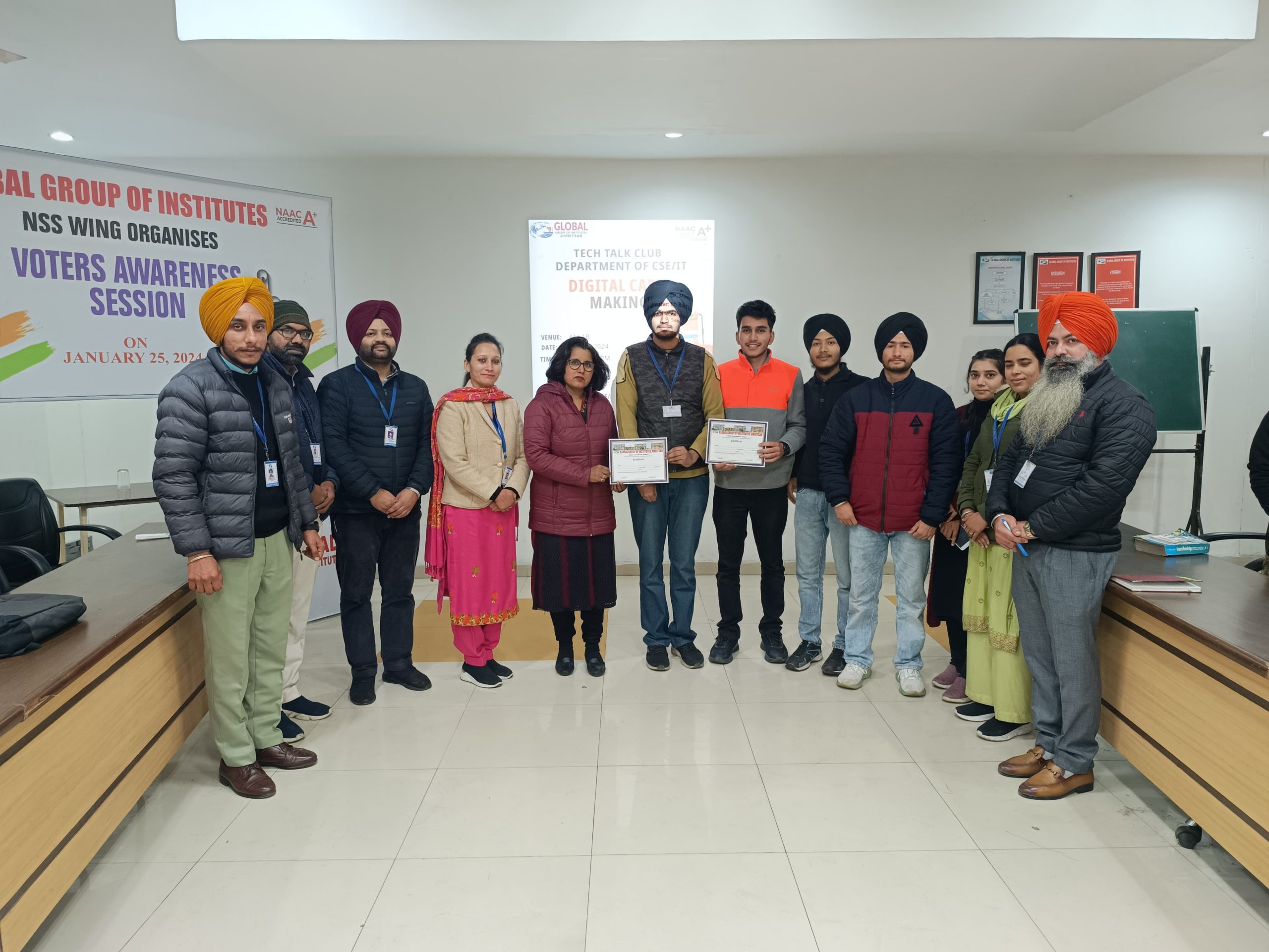 Technovation Club of Department of Computer Science & Engineering/ Information Technology Organized Group Discussion ‘ on 4.02.2016 under the supervision of HOD (CSE) Dr. Sandeep Singh Kang. The Objective of the Event was to create Confidence and awareness of general topics among students. The competition was organized and managed by the faculty and student coordinators of the Club. There were 2 rounds in this competition. Round 1 was the elimination round in which 8 teams (5 students in each) from different streams of B.Tech, (CSE, ECE, IT, ME, Civil), Diploma, HMCT, ATHM, MCA and BCA had participated. Out of those 8 teams, 7 students were selected for the final round. In each round participants were given topic on the spot.. Each team was given 6 minutes to speak on the topic given. First, Second and Third Postions got by Akil Bashir B.Tech (Civil) ,Mahir Bansal (HMCT) and Rashmeen Kaur B.Tech (IT). Cash prizes and Certificates were awarded to winners by Director ,GIMET.