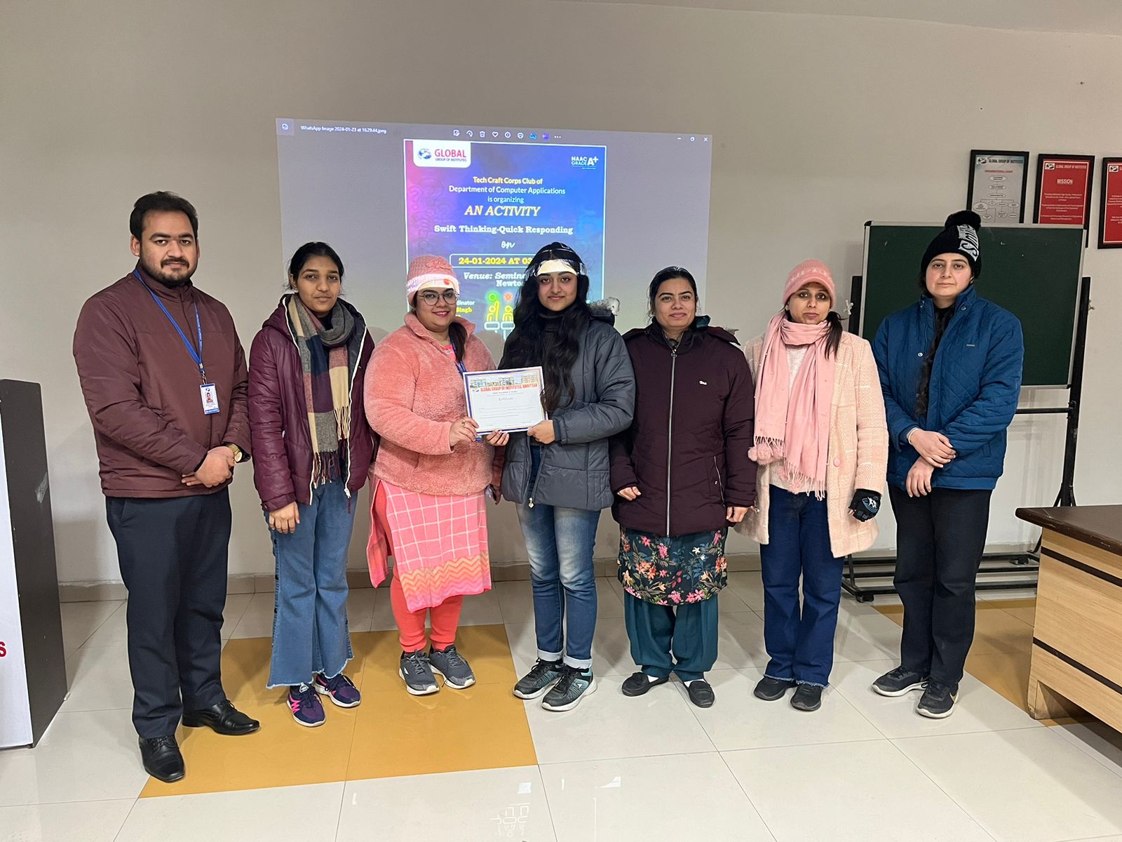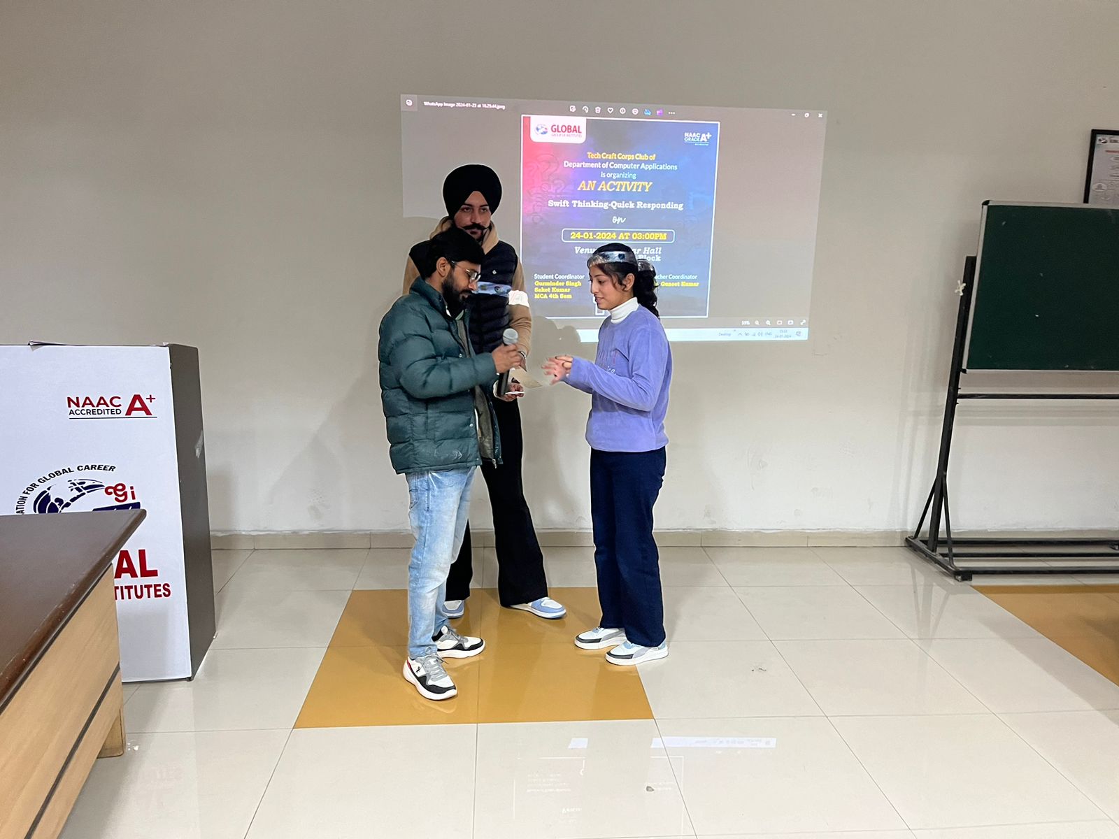 Tech Craft Corps Club of Department of Computer Applications has organized “TECHNICAL QUIZ” during the department activity period. In this event, students of MCA and BCA have participated actively. The aim of the activity was to assess the technical skills and knowledge of the participants.There were 44 participants in first round from BCA & MCA classes out of which 10 were selected to participate in second round. At the end, the winner of competition were1st: Gaurav Kumar (BCA3),2nd: Raminder Kaur (MCA3) and 3rd: Ishqdeep Singh (BCA2)