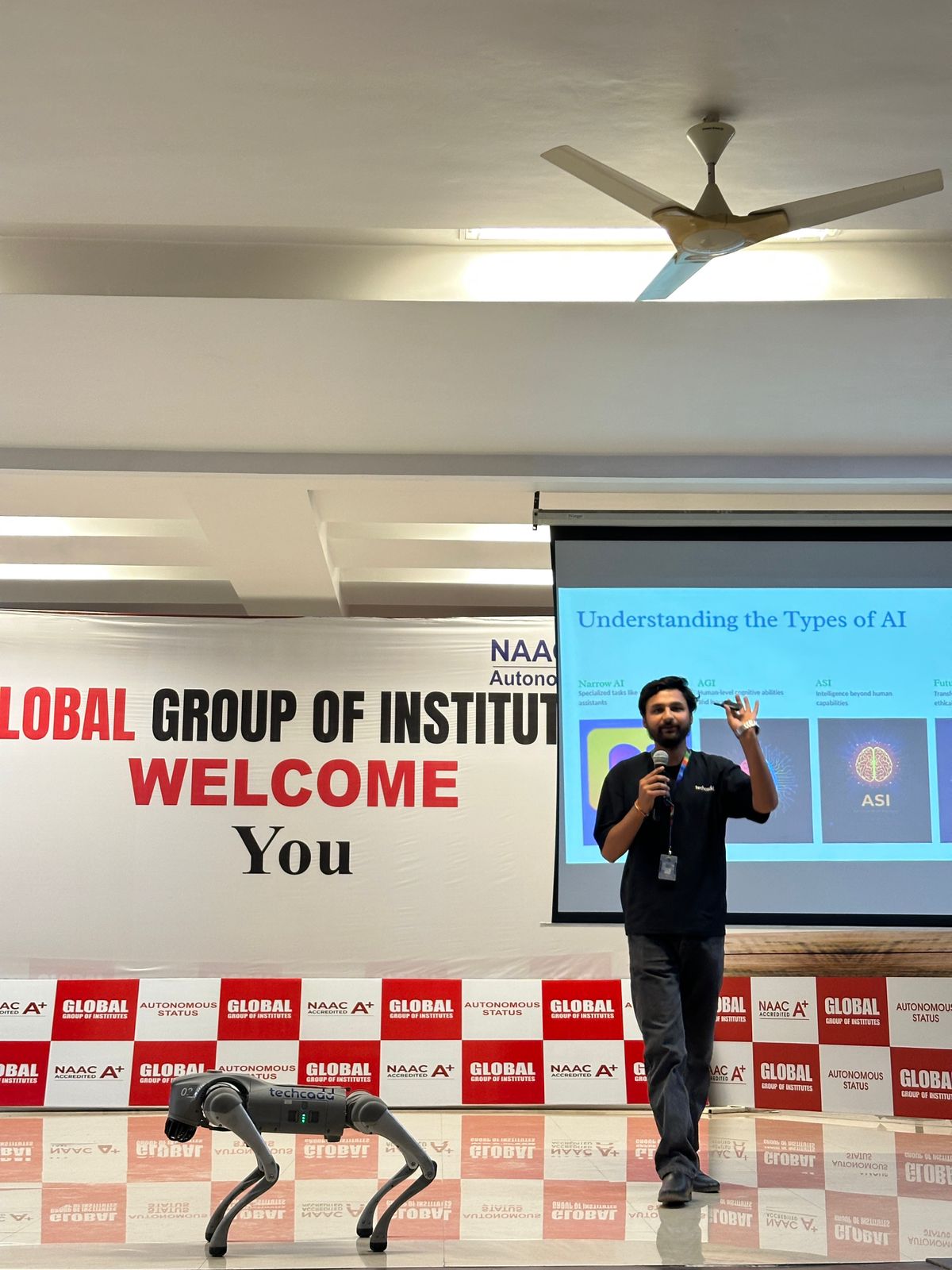 Furthermore, the speaker discussed the integration of AI and robotics in education, making learning more interactive and effective. He shared various real-world examples and demonstrated how modern technologies can simplify complex concepts. A major highlight of the seminar was the live demonstration of a robotic dog named “Chi Chi” brought by the speaker, where he showcased its features and actions, giving students a practical glimpse into robotics and AI applications. He also guided students about emerging career opportunities in AI, the importance of skill development, and staying updated with technological trends. The session was highly engaging, informative, and thought-provoking, capturing the attention of students throughout.