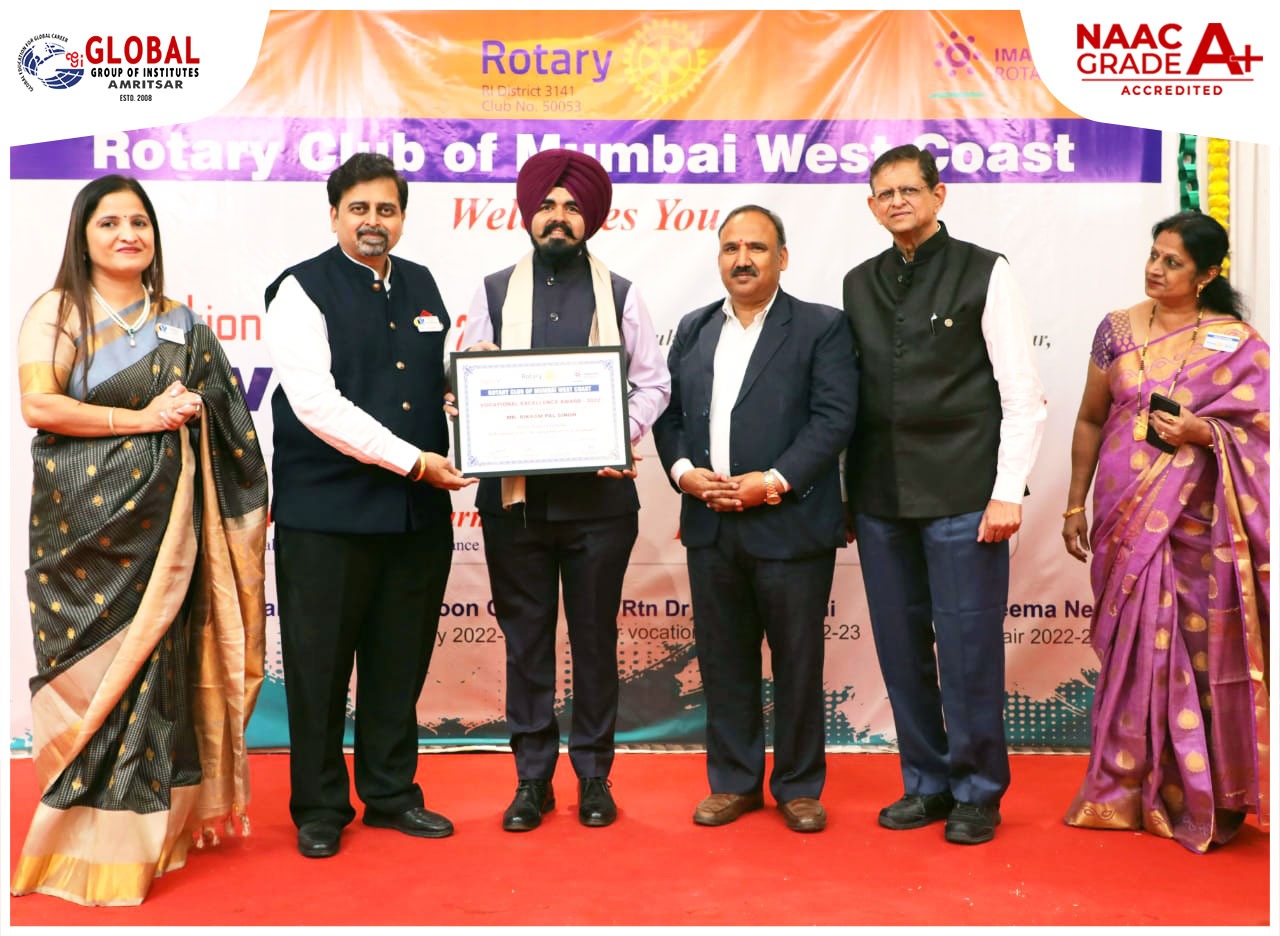 Global Group of Institutes added yet another feather to its cap when its Deputy Dean (Training and Placements) Mr. Bikrampal Singh was honoured and awarded for his role and services as a mentor by Rotary Club Mumbai West Coast in Mumbai.