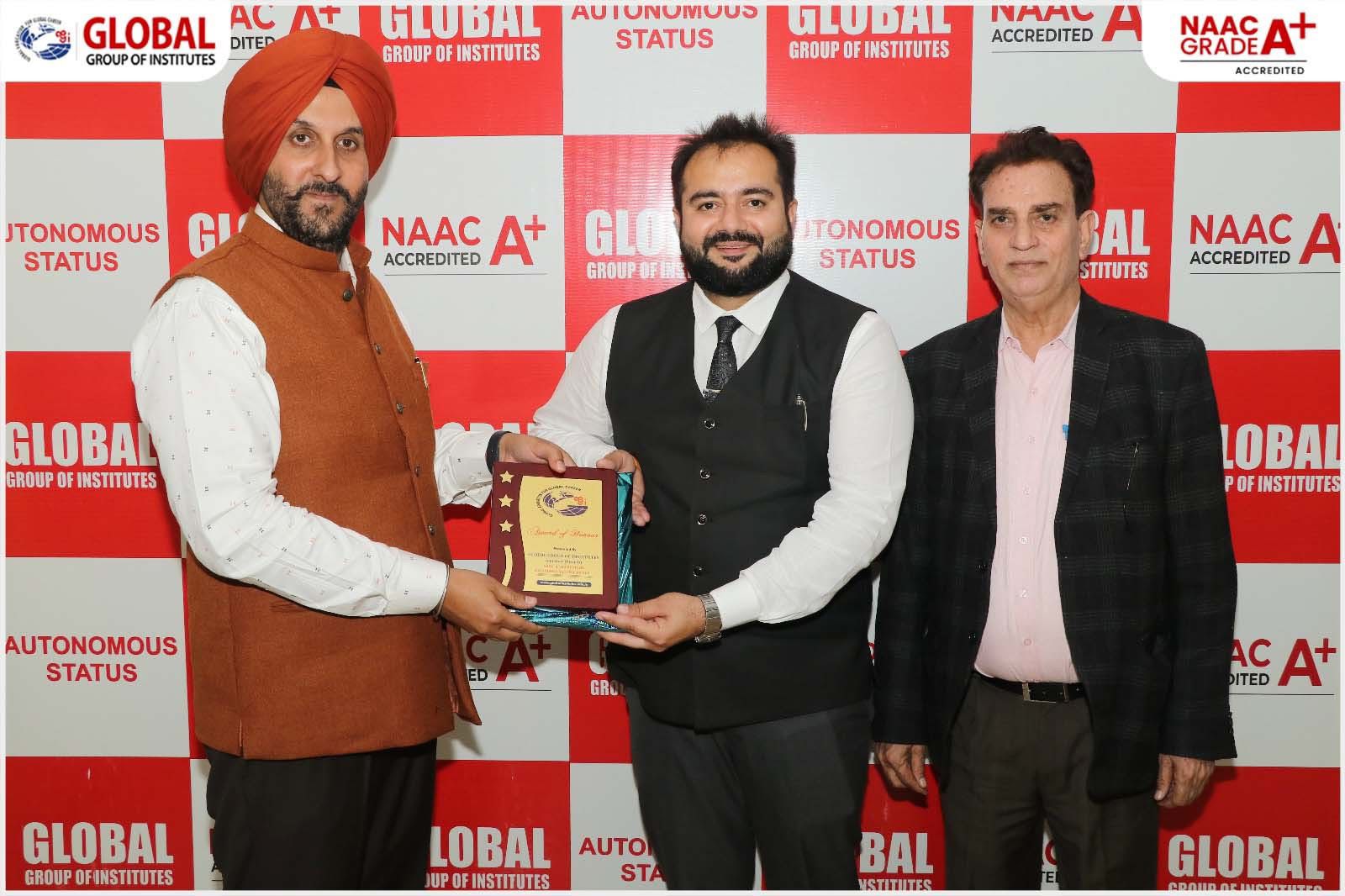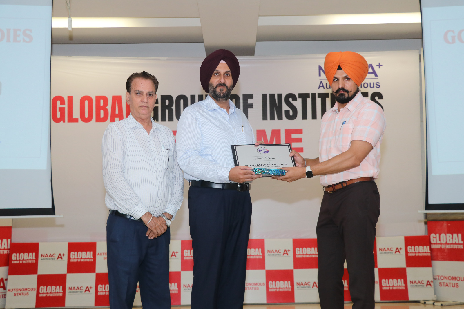 Dr. Akashdeep Singh Chandi, Vice Chairman Global Group of Institutes accompanied by Dr. P. K. Sharma, Dean Students Welfare welcomed and honoured the esteemed guest by presenting him with Bouque and Momento.